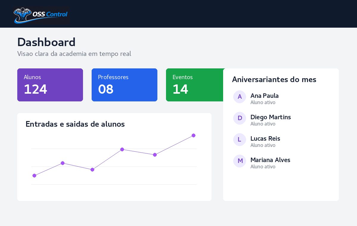 O OSS Control centraliza cadastro, planos, financeiro, professores, avaliações, eventos e pagamentos Pix em uma experiência pensada para quem precisa administrar a operação sem perder tempo.